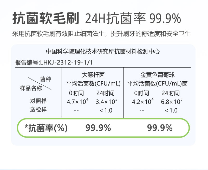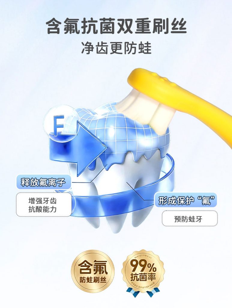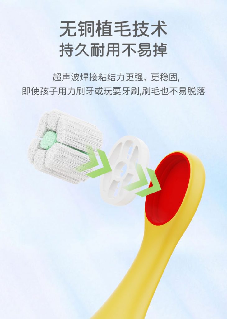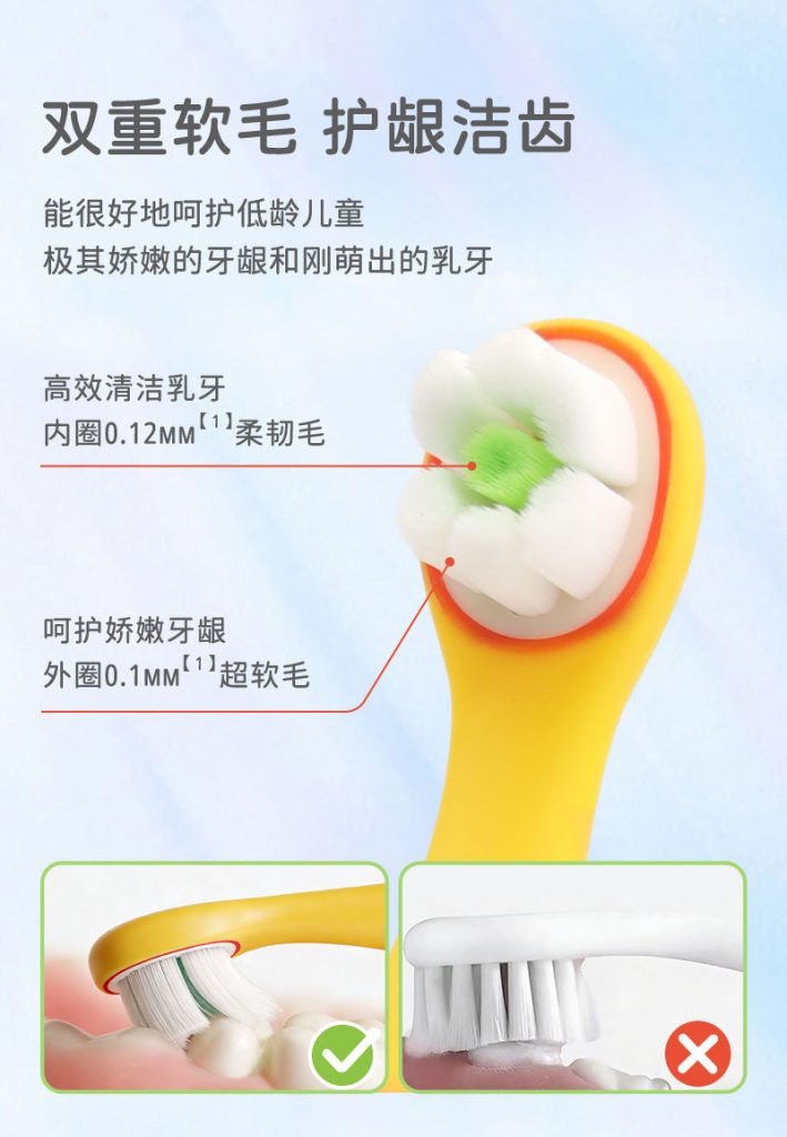 1、双重软毛刷头:内圈0.12mm柔韧毛+外圈0.1mm超软毛,贴合乳牙与娇嫩牙龈,灵活清洁无死角