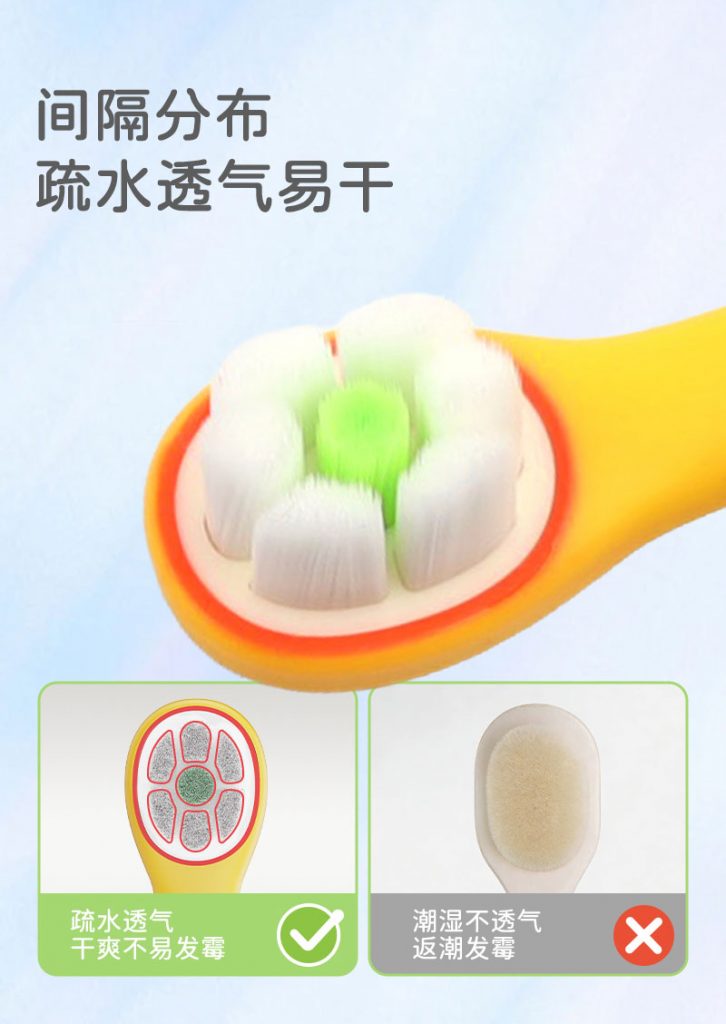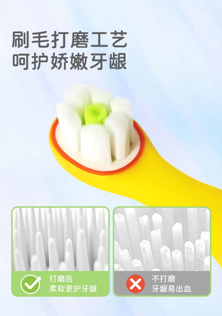 2、磨圆软毛设计:环形布局刷毛,经过打磨工艺,温和护龈无刺激,适配宝宝娇嫩口腔