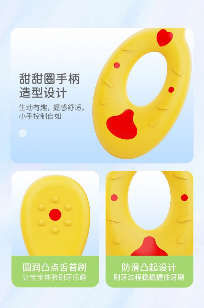 5、甜甜圈软胶握柄:软胶全包裹设计,防滑易握,适配宝宝小手,方便初学刷牙