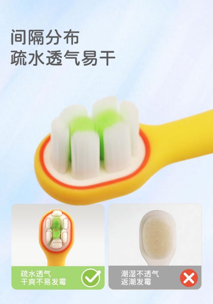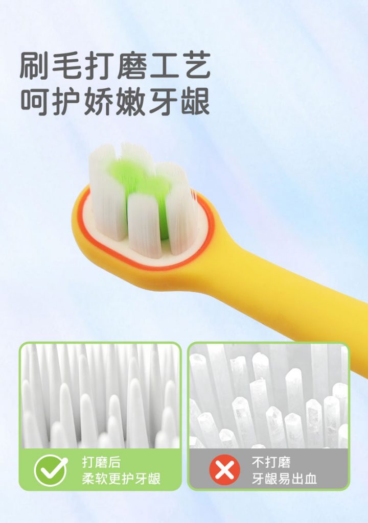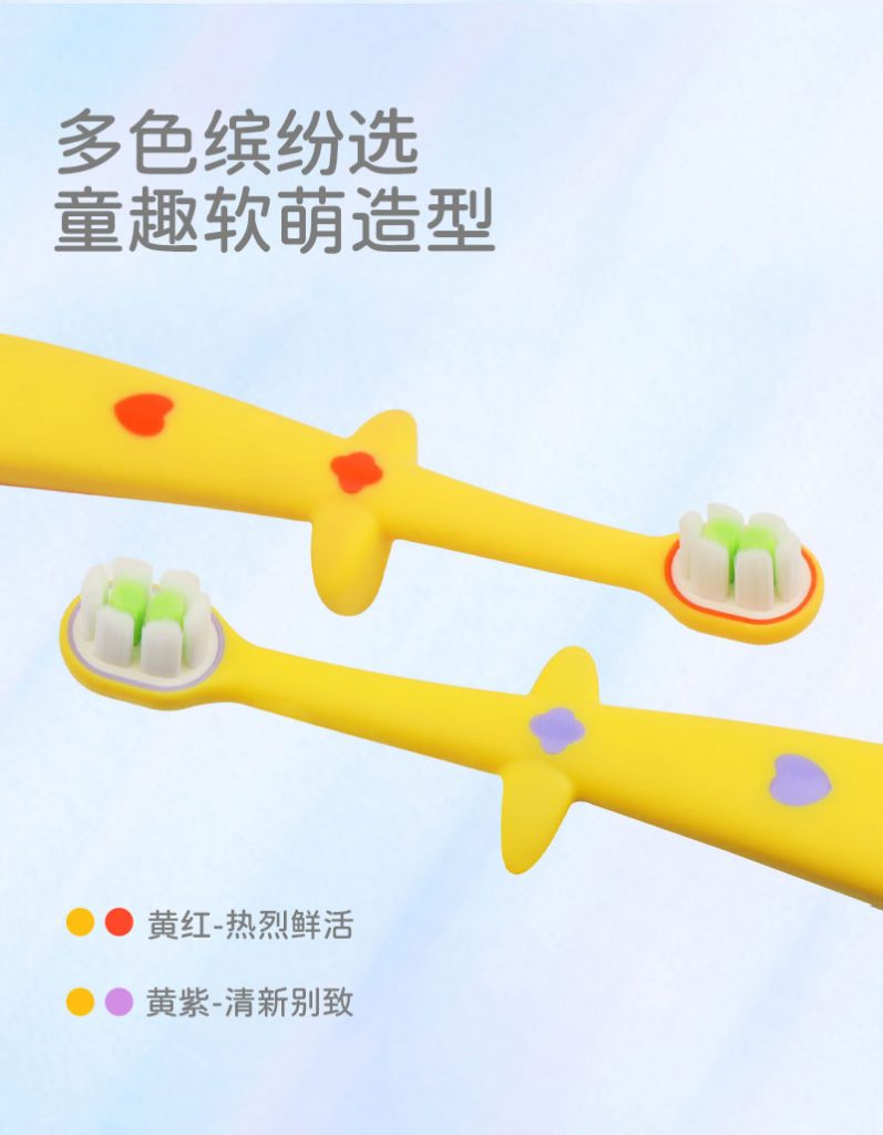 牙刷颜色:多色可选(如展示的黄身配红、黄身配紫等童趣色彩,支持定制)