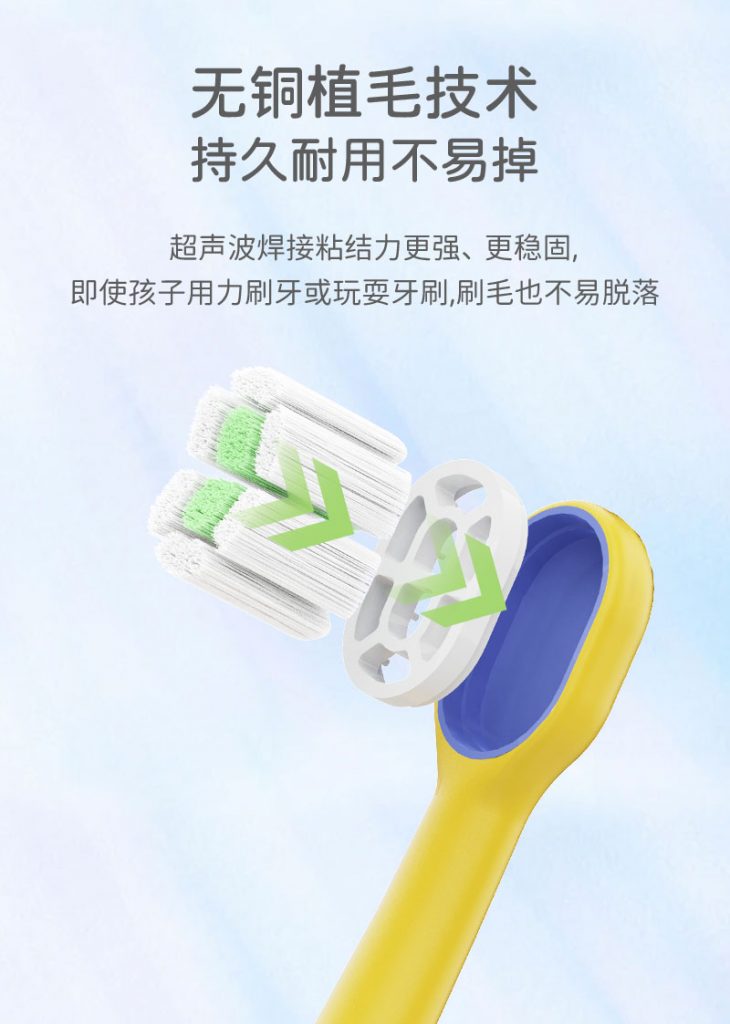 3、耐用植毛:无铜植毛+超声波焊接,粘结牢固,孩子玩耍、用力刷,刷毛不易掉。