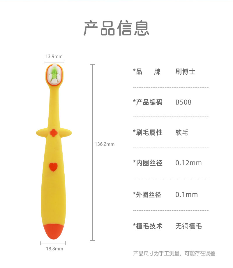 刷博士B508儿童牙刷采用0.12mm云感超细软毛,双重软毛组合,温柔包裹小小萌牙,在清洁牙齿间隙食物残渣与牙菌斑时,减少对稚嫩牙龈的刺激;一体成型防吞食刷头,严守安全标准,搭配加宽防滑防深喉挡片,有效阻挡牙刷深入口腔,避免孩子误吞风险;无铜植毛技术让刷毛持久耐用,超声波焊接不易脱落;童趣造型与多色可选,配合可放平设计、圆润凸点舌苔刷、海豚手柄及防滑波浪纹,助力宝贝养成刷牙好习惯,360°守护口腔健康。