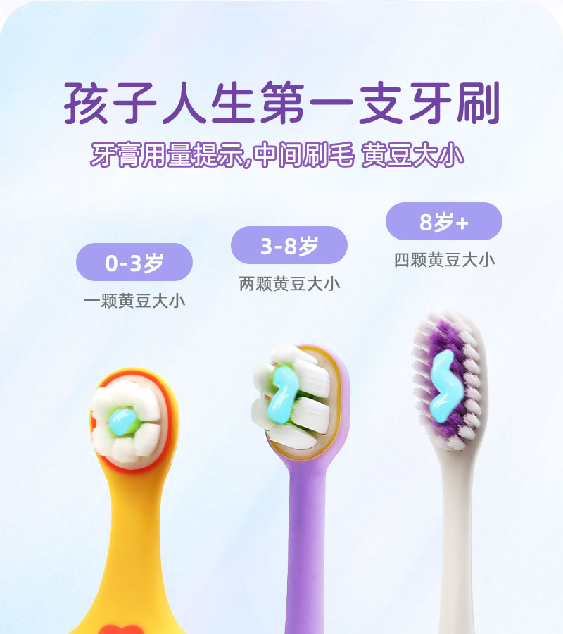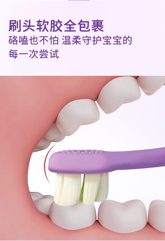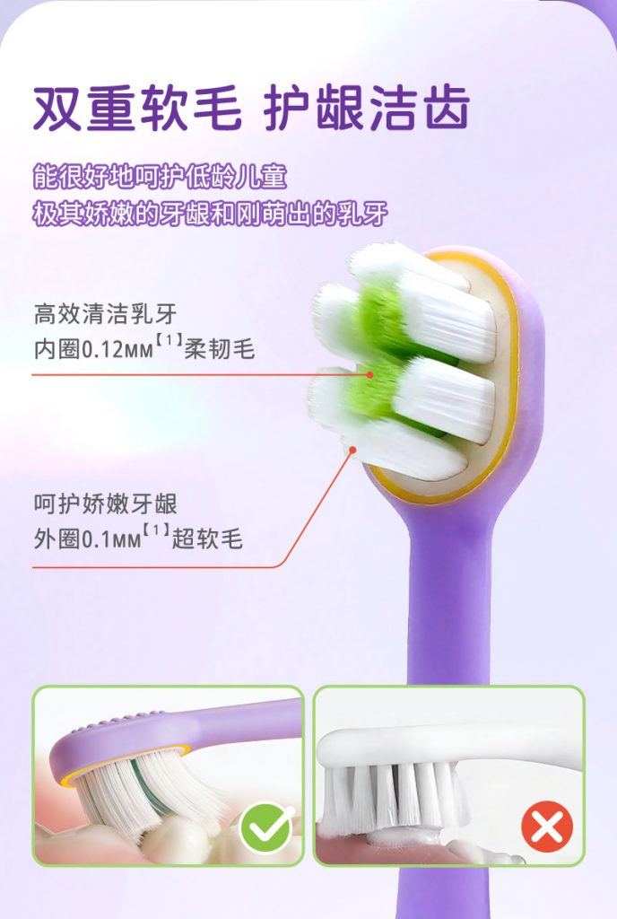 2、护牙软毛:0.12mm尖端软毛,双重组合,清洁同时,减轻对稚嫩牙龈刺激。