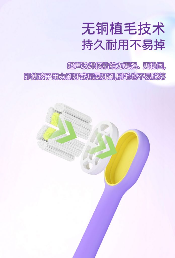 3、耐用植毛:无铜植毛+超声波焊接,粘结牢固,孩子玩耍、用力刷,刷毛不易掉。