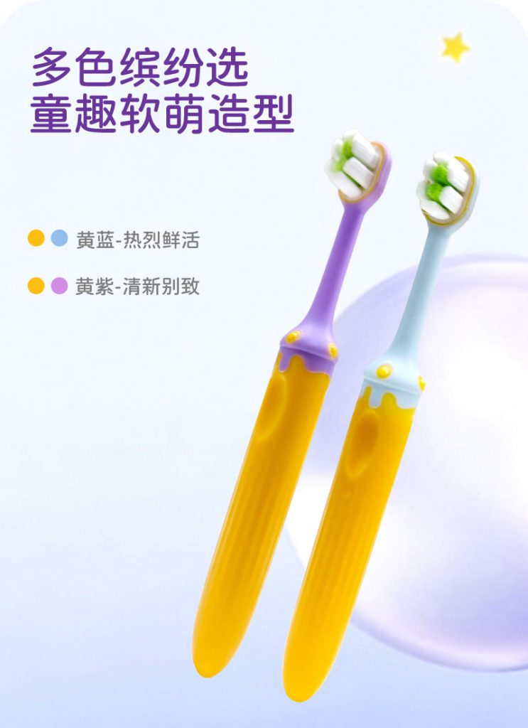 牙刷颜色:多色可选(如展示的黄身配红、黄身配紫等童趣色彩,支持定制)