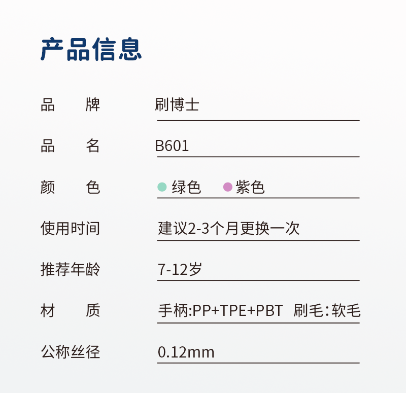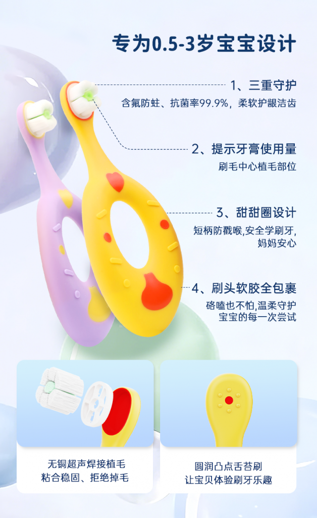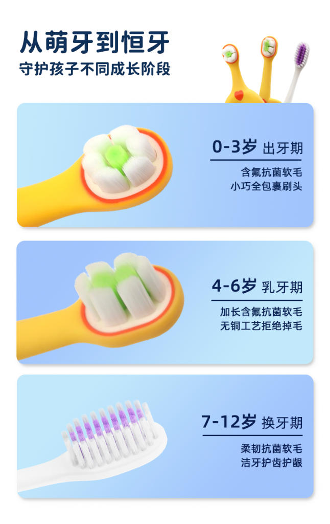 2、护牙软毛:0.12mm尖端软毛,双重组合,清洁同时,减轻对稚嫩牙龈刺激。