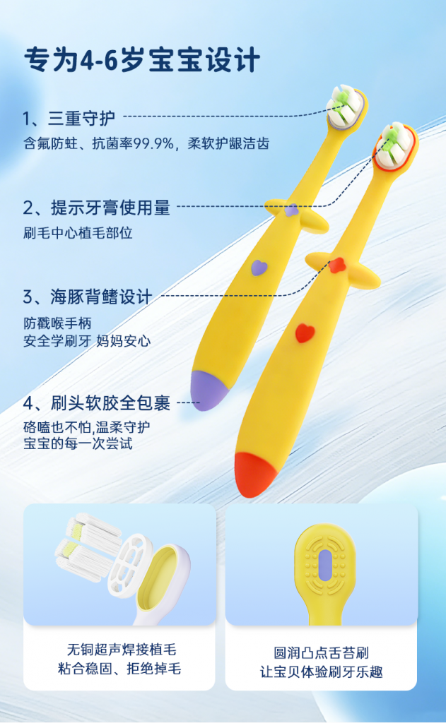 5、细节贴心:可放平设计、凸点舌苔刷、海豚手柄、防滑波纹,兼顾实用与体验。