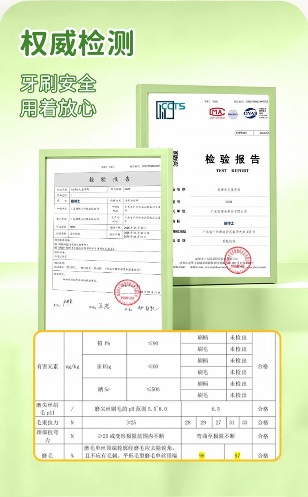 3、安全安心:食品级软包胶 + 99.9% 抗菌认证刷毛,无有害添加,守护孩子成长口腔安全。