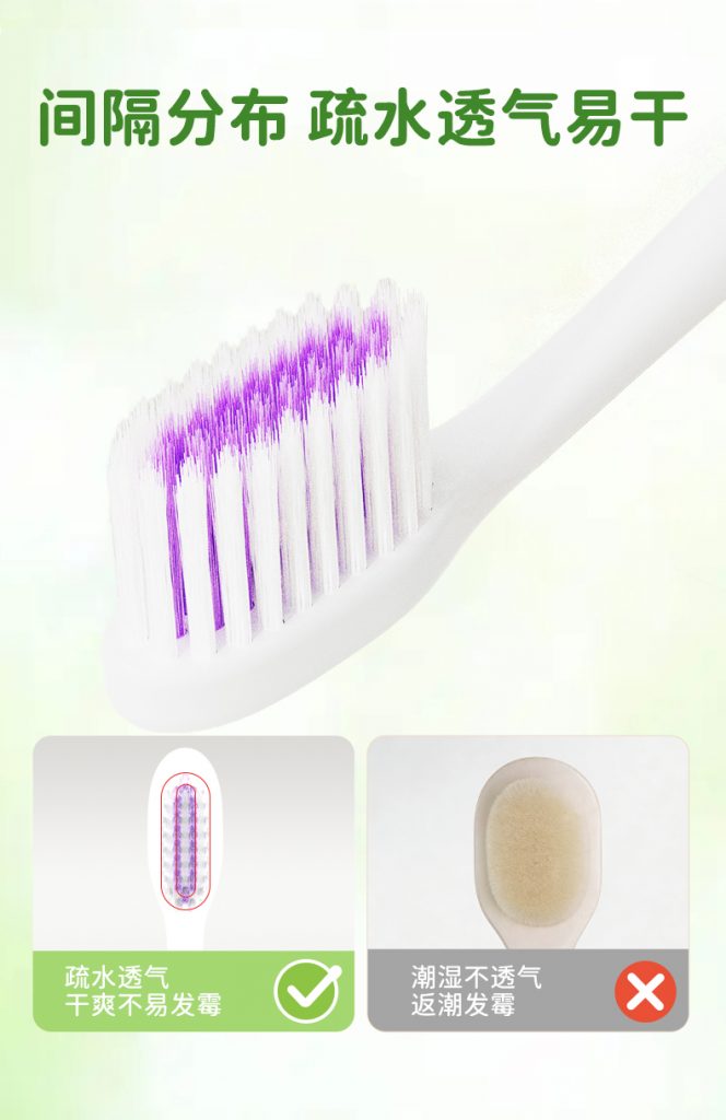 2、洁净透气:间隔分布疏水刷面,深入清洁齿缝,透气易干,减少细菌滋生,告别返潮发霉。