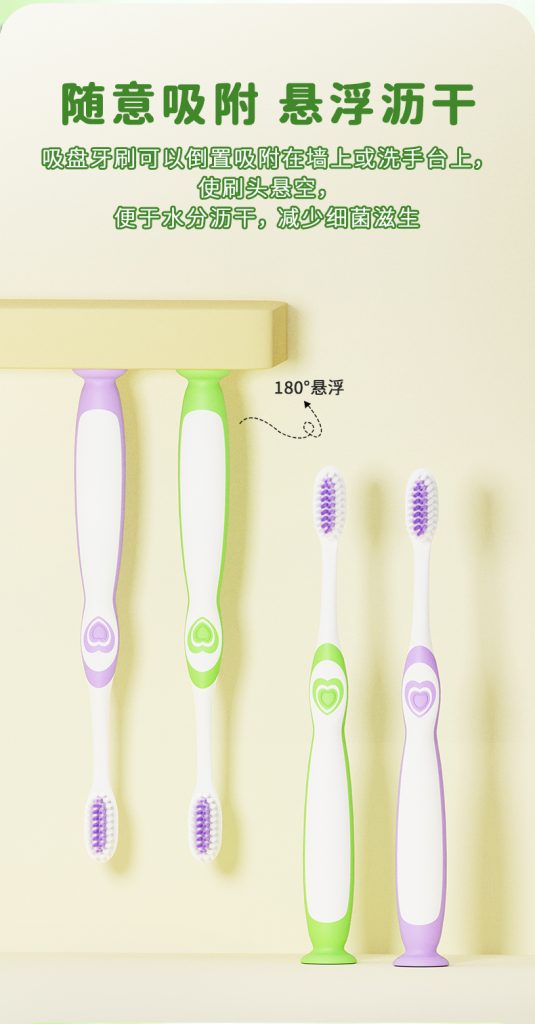 4、便捷收纳:吸盘式站立设计,可倒置吸附沥水,刷头悬空干爽,方便收纳,培养孩子刷牙好习惯。
