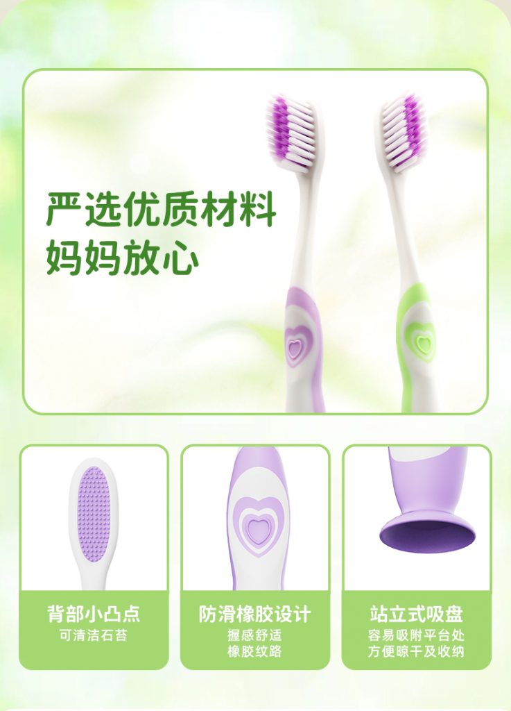 产品材质:PP(刷柄主体)、TPE(软胶包裹)、PBT(抗菌软刷毛)(食品级安全材质,适配儿童使用)